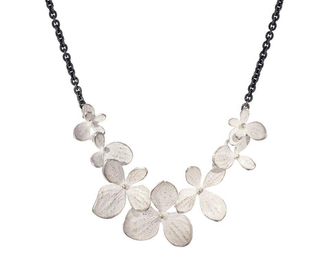 Modern, yet casually sophisticated, this John Iversen necklace possesses a artful, earthy sophistication. Seven of his signature hydrangea flowers are meticulously hand-wrought in bright, white sterling silver and span the center section of the blackened silver chain. Stunning alone, but would also add an organically inspired element to any layered look.