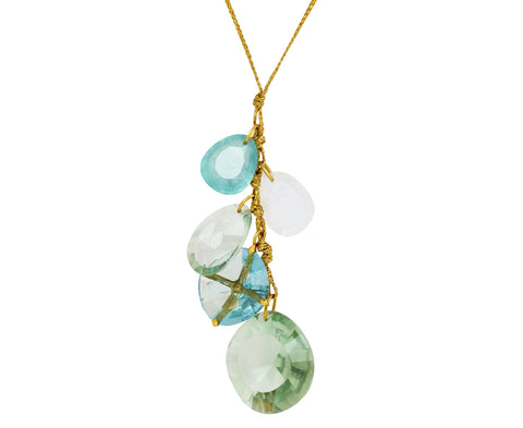 Stunning in its bohemian sophistication, this Pippa Small necklace has a statement-making vibe. Hanging in a cluster in the center of the golden waxed cord are five mixed blue and green stones - four hang freely while one is in an 18K yellow gold caged setting. It fastens with a lobster clasp closure alongside one of Pippa's tiny gold seeds.
