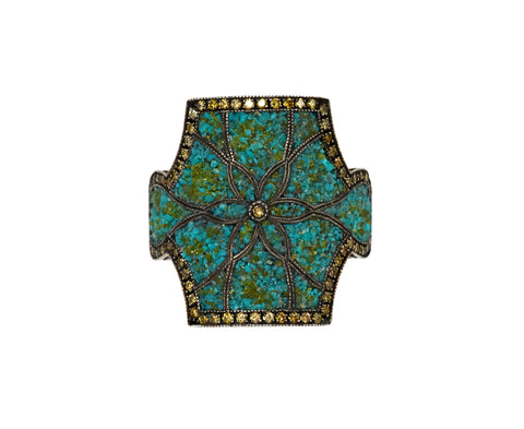 With its bold design and meticulous construction, this Sevan Bicakci shield ring exudes a statement-making presence. The shield shaped ring face is encrusted in a painstakingly precise micro-mosaic of crushed turquoise accented by hints of crushed yellow diamond. Oxidized sterling silver lines create a mandala at the center and the composition is surrounded by a halo of fancy diamonds. It is centered on the 24K yellow gold band and the entire interior of the ring is lined with 24K yellow gold where Sevan has signed, dated, and numbered the piece.