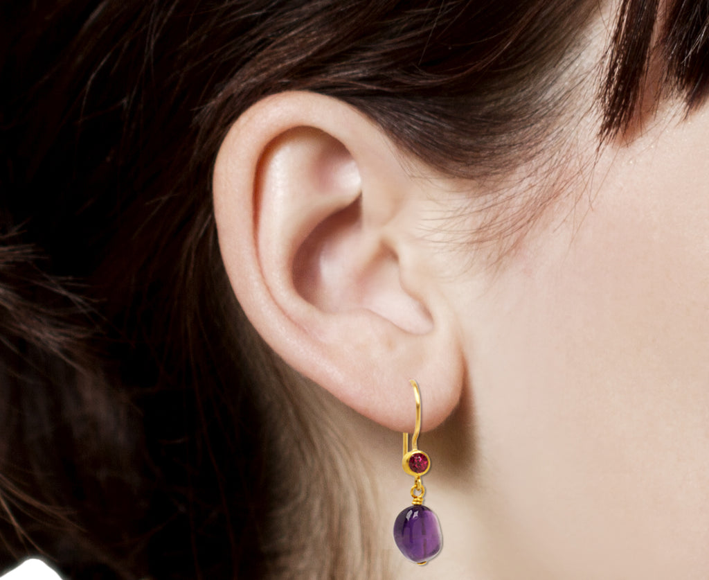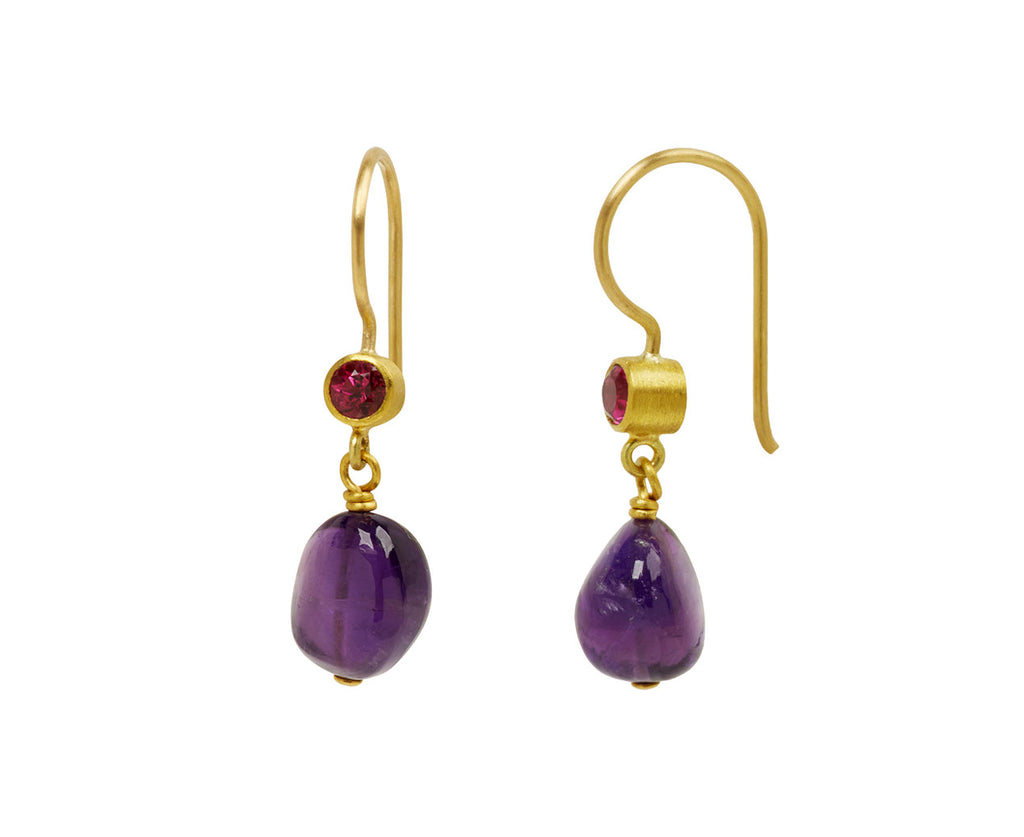 With their contrasting color combination, these Mallary Marks earrings also offer a playful elegance. Faceted, round rubellites are set in 22K yellow gold bezels and connect to the 18K yellow gold ear wires. Quirky, asymmetrical drops of dark purple amethyst anchor the composition which can easily be paired with everything from casual to more formal.