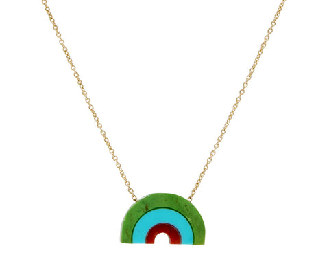 Perfectly combining playful design and a little luck, this Aliita necklace can easily be added to a layered look or worn alone. The 9K yellow gold adjustable chain has a smooth oxidized turquoise, turquoise and coral red rainbow at its center. It closes with a 9K yellow gold spring ring clasp.