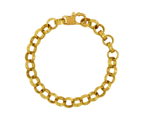 Perfectly balancing antique inspiration with modern design, this Prounis bracelet has a stunning amount of subtle detail. The 22K yellow gold round links have a line running along their center, creating a chain with dimension and weight. It closes with her signature oversized fibula clasp.