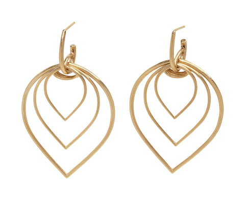 Balancing a bold, earthy design with meticulous craftsmanship, these Nicole Landaw have a stunning movement. The hewn finished 14K yellow gold triple leaf outlines are nestled together but move independently from one another. They hang from the 14K yellow gold huggie hoop and connect to 14K yellow gold post backs.