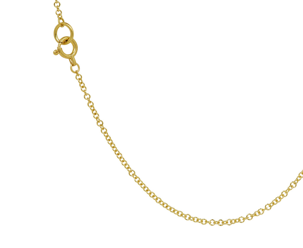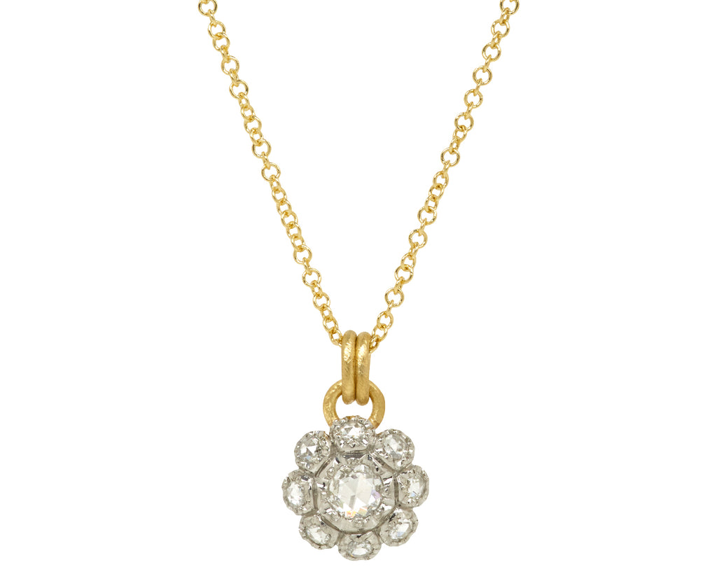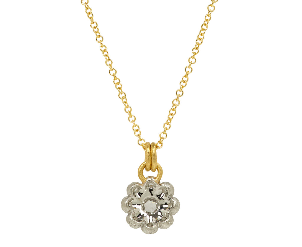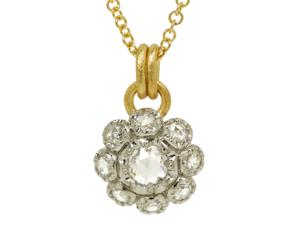 With a ton of sparkle and sweet, detailed design, this hum necklace is a perfect interpretation of a tiny flower. Each round, rose cut diamond is set in a textured 18K white gold bezel to create the straightforward design. The pendant hangs along the 18K yellow gold chain by an 18K yellow gold double bale.