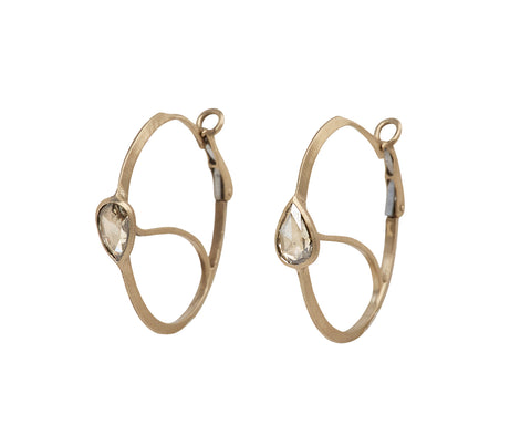 Inspired by French earrings in the 1700s, these Anaconda earrings are perfect for everyday. The thin, 18K palladium white gold hoops have bezel set, mis-matched pear shaped champagne diamonds set front and center and they connect to 18K palladium white gold lever backs. A classic-meets-modern take on the traditional hoop.