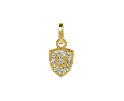 With its stunning sparkle and small scale, this Foundrae medallion can be worn alone or clustered with your other favorites. The 18K yellow gold miniature crest is covered in round, white diamonds surrounding the 18K yellow gold horseshoe. It hangs from the 18K yellow gold push gate bale, creating a pendant that is both modern and timeless.