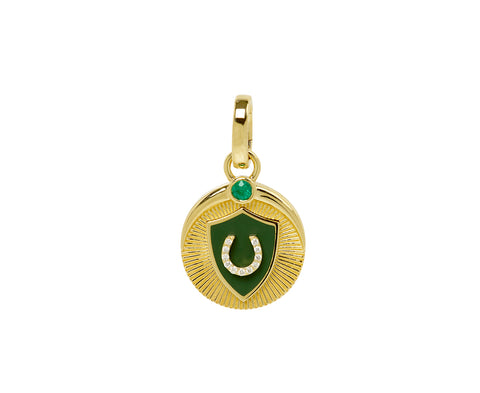 Modern and minimal, add this Foundrae pendant to any your favorite chains. The petite 18K yellow gold medallion has a green enamel shield at its center that is set with shimmering diamonds and hangs from the 18K yellow gold push gate bale. A small, round emerald is set at the top of the medallion for a hint of extra color.