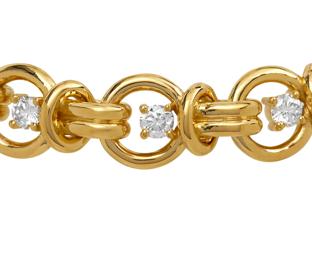 With its modern elegance and substantial weight, this Melissa Kaye bracelet looks amazing whether worn alone or layered with your other favorites. The 18K yellow gold loop links connect to the 18K yellow gold circle links to create the continuous strand which then closes with an 18K yellow gold hidden safety clasp. Round, white diamonds accent the circular links for a statement-making pop of sparkle.