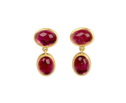 Named after an elongated Ancient Greek jar, these Prounis earrings exude an unparalleled, classic elegance with a hint of warm toned color. Two smooth pink tourmaline ovals are set in closed back 22K yellow gold settings and connect to one another to create the small dangle design. The top pink tourmaline is set east-west and connects to the 22K yellow gold post backs.