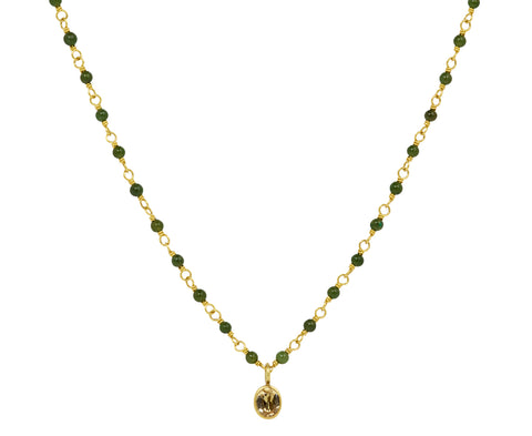 With its earthy color, this Mallary Marks necklace has a quiet sophistication. The strand of smooth, deep green jade beads are wrapped in 22K yellow gold to create the continuous strand. A shimmering peach mali garnet is encased in a 22K yellow gold bezel and hangs from the center. Wear this alone or added to a playful layered look.
