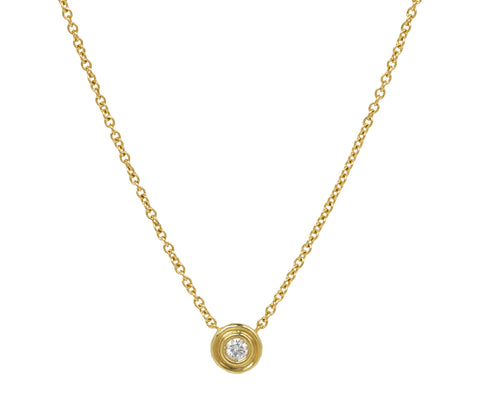 With its subtle, three dimensional design, this Octavia Elizabeth necklace is an understated, easy-to-wear take on the traditional diamond pendant. Hanging at the center of the 18K yellow gold chain is a round, white diamond set in the elevated, double orbit 18K yellow gold round pendant. Perfect alone or layered with your other favorites.