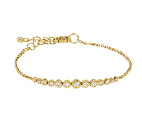 Modern and elegant with a timeless design, this Octavia Elizabeth bracelet has an understated sophistication. Thirteen round, white diamonds graduate in size and are set in individual bezels at the center of the 18K yellow gold chain. It closes with an 18K yellow gold lobster clasp with a section of chain allowing it to be slightly adjustable in length.