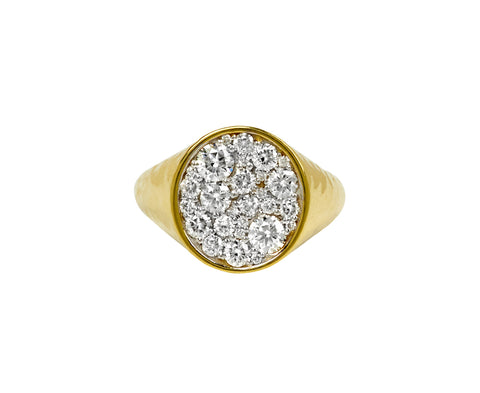 With its jaw-dropping sparkle and easy-to-wear design, this Octavia Elizabeth signet ring exudes a modern sophistication. Round, white diamonds are set in 18K white gold prongs at the center of the 18K yellow gold signet style ring face. It tapers in to the hammered 18K yellow gold band.