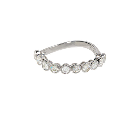 This elegant, modern and sparkling ONDYN diamond ring is a stunning alternative to the traditional wedding band or statement stacker. The sparkling white diamonds are individually set in bezels of 18K white gold linked together so the front of the ring has movement that is fluid and adjusts with every move you make.