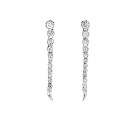 These ONDYN earrings are a modern interpretation of the traditional diamond drops. The cascade of sparkling, round, white diamonds are each set in 18K white gold bezels and taper in size to create an articulated, fluid drop. Fluid and slinky, these earrings are inspired by water and move just the right amount with every turn of your head.