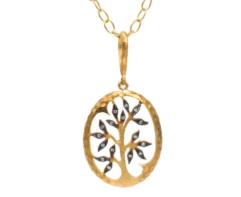 A stately tree representing the growth and span of life is wrought in 22K gold with leaves of blackened 22K gold and diamonds. This timeless and powerful symbol embodies the beauty and trans-formative nature of the passing of years. A lovely pendant to wear as a reminder. Here we have it hanging from her 22K yellow gold tiny lacy chain (sold separately).