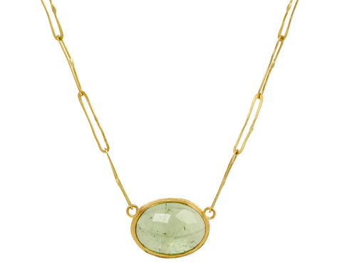 With its earthy, subtle color and handmade links, this Judy Geib echo necklace is the perfect addition to any collection. Centered in the 18K yellow gold elongated links is an oval, cabochon, pale green tourmaline. It is set in an open backed 18K yellow gold bezel to create a necklace with distinctive, contemporary sophistication.