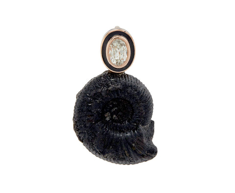 With its bold, earthy vibe, this Dezso charm pendant is a prehistoric relic. The fossilized ammonite is actually an extinct marine invertebrate. It is capped with an oval white sapphire, creating an interesting juxtaposition of color and sparkle. The white sapphire is set in an 18K rose gold and enamel bezel which also acts as the bale, allowing the charm to be strung on any of your favorite chains.