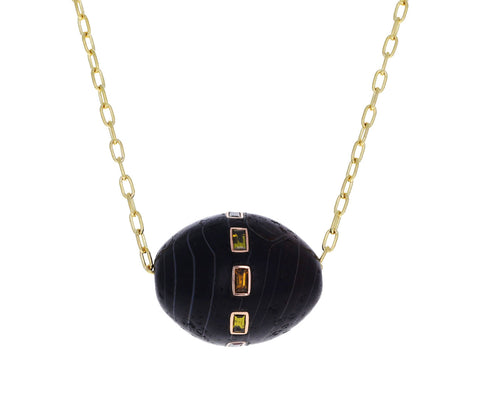 With its bold, playful, and beachy sophistication, this Dezso pendant is a dark-toned composition of ancient agate and various toned yellow garnets. The ancient agate is hand-carved into a smooth bead with a stripe of rectangular yellow garnets along its center. Each stone is set in an 18K rose gold bezel. Add it any one of your chains for a hint of surfer chic style.