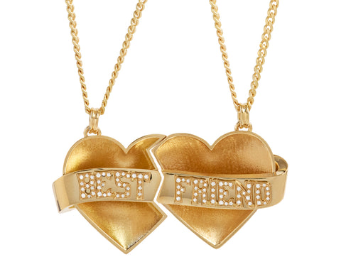 With its sweet design and playful luxury, this Marie Lichtenberg necklace is meant for you an your bestie. Each of the 18K yellow gold concave heart pendants hangs from a short, 18K yellow gold spiga chain. On one half of the heart is a diamond 'best' and on the other a diamond 'friend', each backed by an 18K yellow gold ribbon design. A truly elevated version of the best friend necklaces from your childhood.