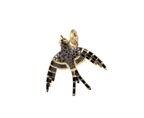 This Storrow charm is the perfect way to add a touch of edgy sparkle to any look. The 14K yellow gold bird has been hollowed out and covered in a surface of sparkling round and baguette black diamonds. It hangs from the 14K yellow gold clasp bale and looks amazing alone or layered with your other favorite charms!