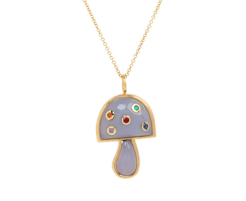 Inspired by the playful magic of make-believe worlds, this Brent Neale necklace exudes a bold presence and pop of color. The lavender blue chalcedony mushroom is set on a frame of 18K yellow gold and set with shimmering rainbow sapphires scattered across its surface. The pendant hangs from the center of the 18K yellow gold chain which fastens with a lobster closure. Perfect alone, it also adds a cheeky vibe to a layered necklace look.
