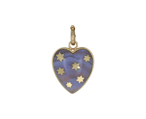 This stunning blue chalcedony Storrow charm is the perfect vintage inspired keepsake to wear around your neck as a constant reminder of love. Playful and modern, the blue chalcedony heart is set with 14K yellow gold stars and set on a 14K yellow gold frame. It hangs from the 14K yellow gold clasp and can be worn hanging from your favorite chain necklace or bracelet.