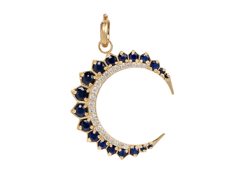 This stunning, shimmering Storrow crescent charm is a jaw dropping example of modern meets vintage design. The 14K yellow gold crescent is set with an exterior row of dark blue sapphires and interior row of shimmering diamonds for the perfect combination of sparkle and color. It hangs from the 14K yellow gold clasp and looks amazing alone or layered with your other favorite charms!