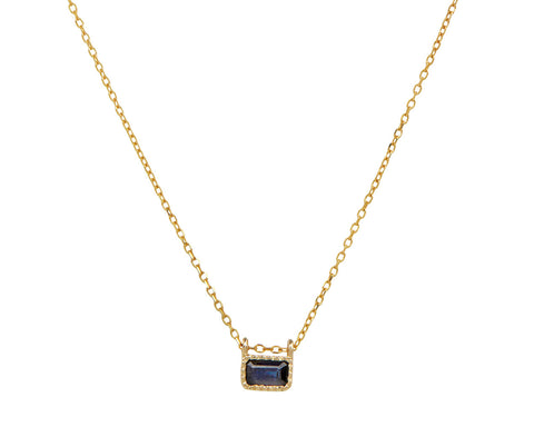 Modern with a timeless vibe, this Jennie Kwon necklace adds a playful element of color to any collection. The faceted dark blue sapphire is surrounded by a milgrain frame of 14K yellow gold. It hangs from the base of a 14K yellow gold chain and can be worn alone or layered with your other favorites.