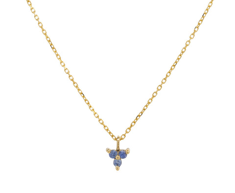 With its quiet, modern elegance, this Jennie Kwon necklace is a contemporary take on the traditional colored stone pendant necklace. The tiny round sapphires are set in 14K yellow gold prongs and arranged in a triad at the base of the 14K yellow gold chain. Wear it alone or layered with your other favorites.