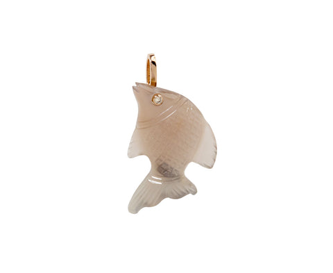With its playful, beachy vibe, this Dezso charm pendant is a piece of iridescent moonstone hand carved into the shape of a fish. It is set with a tiny white diamond eye and hangs from an18K rose gold bale. Add it to any of your favorite necklaces or wear it solo for a surfer chic addition.