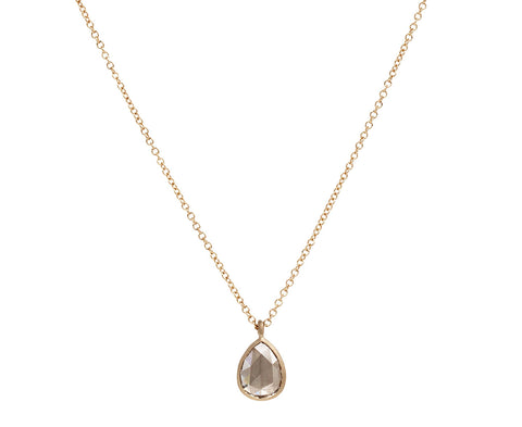 With a breathtaking, stark elegance, this minimal Anaconda diamond necklace makes a stunning, restrained alternative to the traditional version. The pale champagne rose cut diamond teardrop is framed in warm-toned 18K white gold to create the pendant which hangs from the 18K white gold chain . This is the kind of necklace you will reach for to wear every single day.