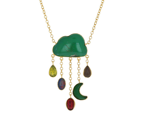 With its sculptural, mobile-like, eclectic elegance, these Grainne Morton necklace is a stunning collection of little vintage trinkets. Hanging from the carved chrysoprase cloud are dangling multi gems. Full of movement, their balanced composition adds to their eye catching, statement making vibe.