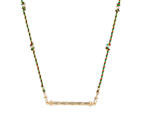 With its minimal, modern design and subtle sparkle, this Marie Lichtenberg necklace has a statement-making design. The 18K yellow gold candycane pendant is set with a swirling diamond stripe and hangs at the center of the long silk thread and pearl chain. Perfect alone, it also adds a playful vibe to a layered necklace look.