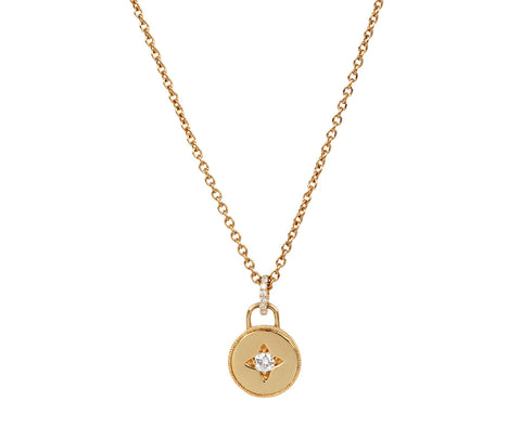 Inspired by the history and heritage of Southeast Asia, this stunning State Property necklace is the perfect way to add a touch of movement to your neck. Hanging at the center of the adjustable 18K yellow gold chain is a round 18K yellow gold charm set with a round, shimmering diamond at its center. The charm hangs from the diamond set 18K yellow gold bale.