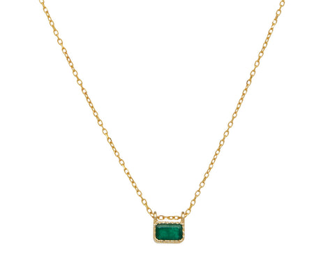 Modern with a timeless vibe, this Jennie Kwon necklace adds a playful element of color to any collection. The faceted deep green emerald is surrounded by a milgrain frame of 14K yellow gold. It hangs from the base of a 14K yellow gold chain and can be worn alone or layered with your other favorites.