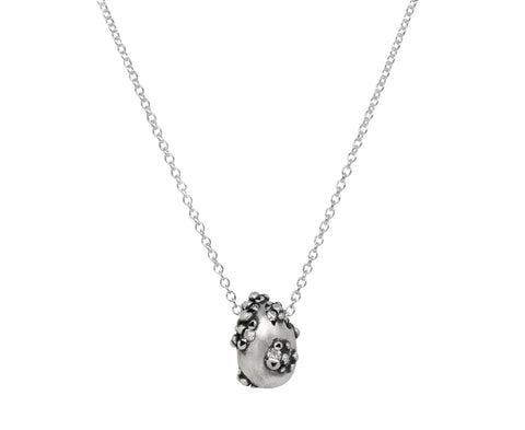 Modern, minimal and the perfect piece to wear with your everyday favorites, this Branch pendant also has an earthy, sculptural presence. The matte sterling silver egg pendant is encrusted with tiny white diamonds and little beads. It hangs from the center of the silver chain to create a simple necklace you can wear solo or add to a layered collection.
