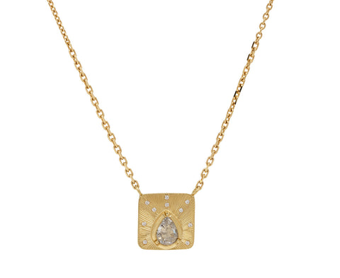 With its modern design and statement-making sparkle, this Brooke Gregson necklace is a perfect update to the traditional diamond pendant. The teardrop shaped natural diamond is set in an 18K yellow gold bezel at the center of the engraved 18K yellow gold pendant which is set with a halo of shimmering diamond lines. It hangs from the center of the adjustable 18K yellow gold chain and looks perfect whether worn alone or layered.