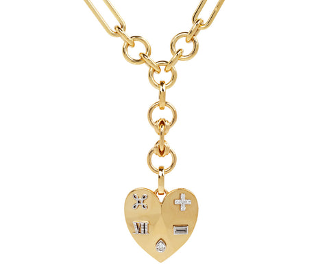 Solid and substantial, this Foundrae necklace will become your everyday talisman. Hanging from the 18K yellow gold never ending knot and annex link extension, which can be easily removed from the midsized mixed clip chain, is a faceted heart pendant set with five symbols of love covered in tiny white diamonds. With its bold, emblematic presence, it's a perfect necklace to wear every single day.