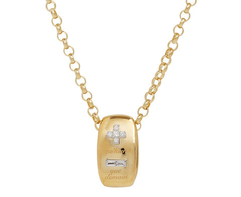 This simple yet modern Foundrae necklace is the perfect way to add a hint of symbolic sparkle to any look. The front of the oversized 18K yellow gold heart beat is set with a diamond plus and minus sign along with the engraved words 'qu'hier' and 'que demain' while the back is engraved with 'more than yesterday and less than tomorrow'. It hangs along the 18K yellow gold medium belcher chain which closes with an 18K yellow gold lobster clasp.