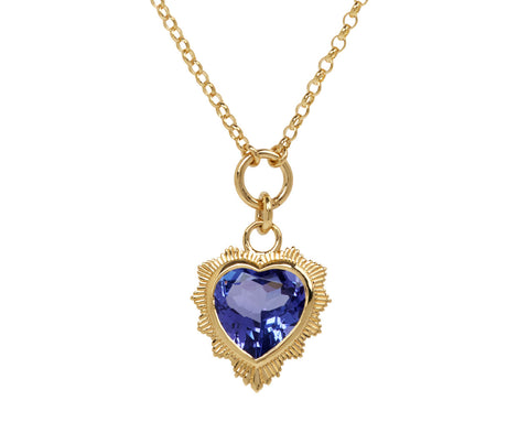 Stunning in its vibrant, cool tone and modern design, this Foundrae necklace will add a sweetly symbolic vibe to any layered look. The faceted tanzanite heart is set at the center of the radiating 18K yellow gold halo. It hangs from the center of the adjustable 18K yellow gold chain.