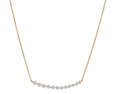 With its stunning, modern, minimalist design, and show stopping sparkle, this shimmering Anita Ko necklace exudes an eye-catching vibe. Hanging from the center of the 18K yellow gold chain is a subtly curved horizontal bar set with a row of tapered diamonds (2.3cttw). A definitive contemporary classic and timeless necklace.