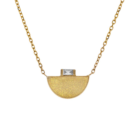 With its delicate presence and a hint of sparkle, this Jennie Kwon necklace is a modern, minimal alternative to the traditional diamond pendant. Hanging from the center of the 14K yellow gold chain is a tiny, horizontally set diamond baguette with a little half circle disc attached below. The surface of the disc is subtly textured (like the moon!). Wear it solo or layered with your other favorite necklaces.