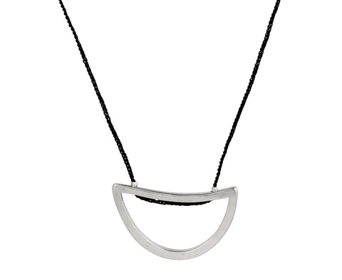 Stylish yet simple, this Jill Platner necklace has a minimal, modern design. The hand hammered sterling silver half moon pendant hangs from the center of the short black gortex chord. This necklace was designed to withstand anything!