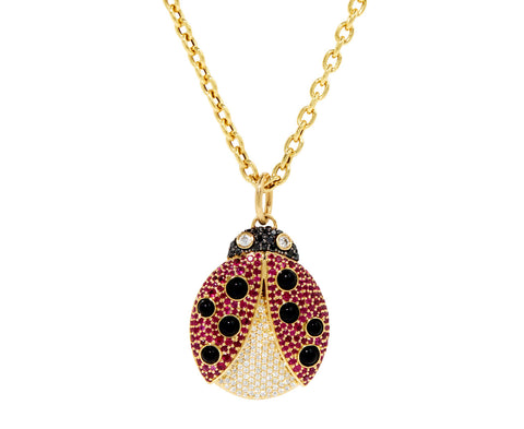 Stunning and statement-making, this Grace Winfrey necklace has a breathtaking amount of details. The large ladybug is composed of tiny ruby and black onyx wings surrounding the white diamond body below the black diamond head. It hangs from the mid-length 18K yellow gold chain. Wear it alone or layered with your other favorites for a pop of decadent whimsy.