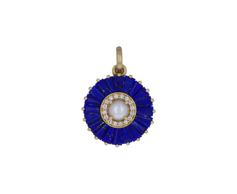 Stunning in detail and vibrant color, this extraordinary Storrow pendant exudes a vintage talismanic vibe. The 14K yellow gold charm is set with lapis and a center pearl with sparkling diamonds. It hangs from the 14K yellow gold clasp, positioned to be a versatile addition to any chain bracelet or necklace.