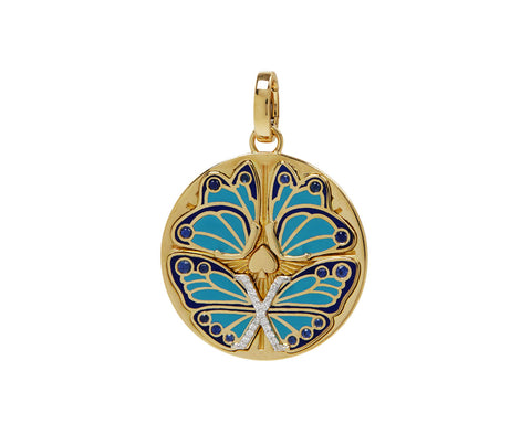With its graphic design and vibrant color, this Foundrae pendant will become your everyday talisman. The 18K yellow gold medallion has three butterflies at its center set with vibrant blue and turquoise ceramic. A tiny gold spade and and shimmering diamond X accent the composition along with round, blue sapphires. It hangs from an 18K yellow gold push gate and is perfect hanging alone or alongside any of their other medallions.