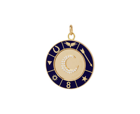 With its graphic design and neutral color, this Foundrae medallion is a perfect personal talisman. The 18K yellow gold medallion is set with an exterior rim of blue Champlevé. At the center of the medallion sits a dimensional crescent set with tiny sparkling diamonds. Various symbols from many of Foundrae's tenets sit within the blue enamel, creating a statement-making medallion you can wear with any of your favorite chains.