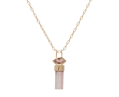 Quietly cool and perfect for everyday, this Celine Daoust necklace makes a statement despite its diminutive size. The pale pink rough pencil tourmaline hangs below a marquise, bezel set pink tourmaline. It hangs from the center of the 14K yellow gold chain, making it a perfect piece to layer with your other eclectic favorites.