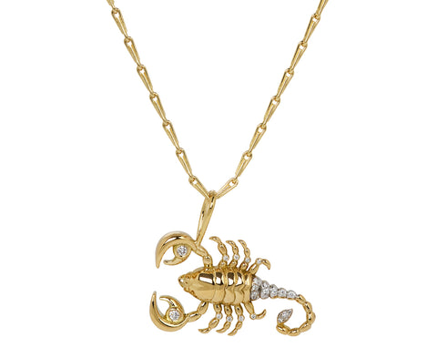 With its straightforward design and brightly polished gold, this Brent Neale necklace is the perfect way to represent yourself or any of your loved ones. The 18K yellow gold scorpion has diamonds in its pincers and a shimmering rhodium and diamond tail. It hangs from the 18K yellow gold chain.